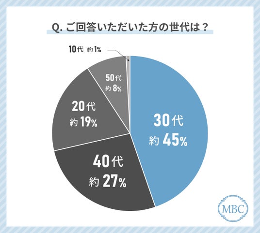 「回答者の年齢をお答えください」とアンケート調査した結果、30代(45%)、40代(27%)、20代(19%)、50代(8%)、10代(1%)でした。