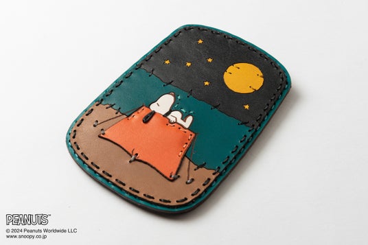 月夜の下、テントで過ごすビーグル・スカウトの1コマを表現したカードケースでは、テントの上で寝るスヌーピーの姿をカラフルなレザーとハンドステッチにより描き出しました。