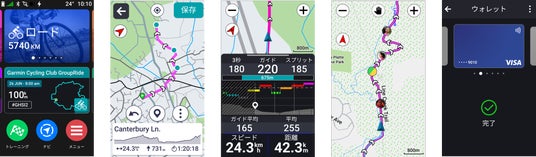 左から、ロードサイクル、コース作成機能、パワーガイド、グループライド位置情報共有、Garmin Pay