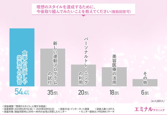 「理想のスタイルを達成するために、今後取り組んでみたいことを教えてください(複数回答可)」と質問したところ、『食事の見直しや栄養学の学習(54.4%)』と回答した方が最も多いという結果になりました。半数以上の方が、食事を見直すことで理想のスタイルを達成したいと思っていることが明らかになりました。