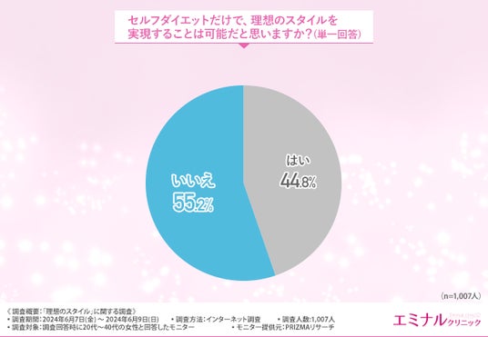 「セルフダイエットだけで、理想のスタイルを実現することは可能だと思いますか?(単一回答)」と質問したところ、約6割の方が『いいえ(55.2%)』と回答しました。■セルフダイエットでは理想のスタイルが実現できないと思う理由とは