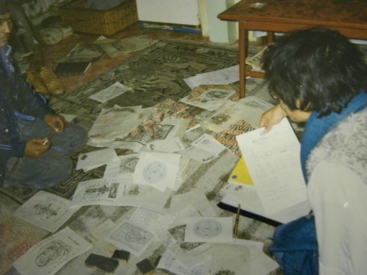 【1985~6年頃】図案を広げ、打ち合わせするBOSSとネパールのメーカーの青年
