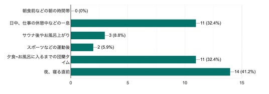 次に、CBD製品の利用者を対象に、どのようなシーンで利用しているか調査した所、「夜、寝る直前」が最多となりました。