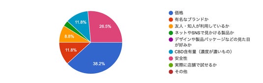 次に、CBD製品を選ぶ際に最も重要視している点について調査した所、価格が38%と最も高く、次いで安全性となりました。