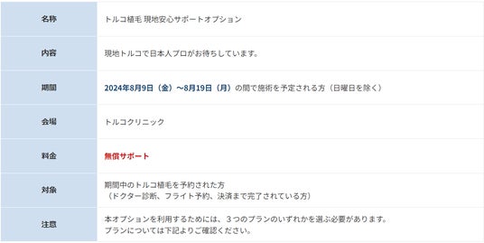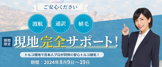 トルコ植毛 現地安心サポートオプションは、現地で日本人プロを備え、海外での植毛に不安を抱える方のための特別オプションとなります。トルコ現地での提供を予定しており、2024年8月9日~19日の期間限定サービスとなります。