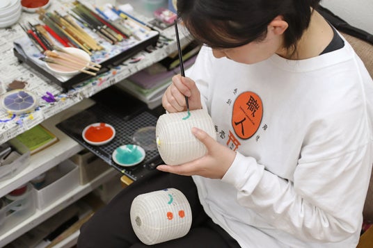 八女提灯の伝統技術を受け継いだ若い職人が一つ一つ絵付けを行う。