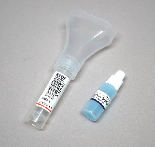 以前は、唾液回収容器(チューブ)の中に保存溶液が入っている検査キットを使用していましたが、唾液を採取する際、容器に保存溶液が入っていることに気づかず、溶液をこぼしてしまったというお声をいただくことがありました。これを防ぐため、唾液回収容器と保存溶液を分け、唾液を採取した後、別の容器に入った保存溶液を入れるタイプの検査キットへ変更しました。また、これまでの保存溶液は無色透明でしたが、リニューアル後は、目で見て分かりやすいよう水色の色付きのものにしています。