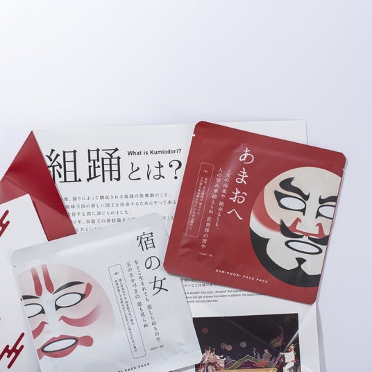 肌を保湿するための美容フェイスパック。沖縄の古典芸能"組踊"のデザインがプリントされています。美容液成分には、琉球舞踊家の化粧下地"モクロウ"や沖縄の自然素材が配合されています。沖縄伝統を肌で感じるパック。プレゼントや結婚祝いなどでも人気です。