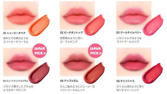 こんにゃくゼリーをイメージしたうるつやテクスチャーに、フルーツのように明るいカラーを6色展開。べたつかず軽いテクスチャーにこだわり、マイルドなプランプ効果*1で唇をナチュラルにボリュームアップ。