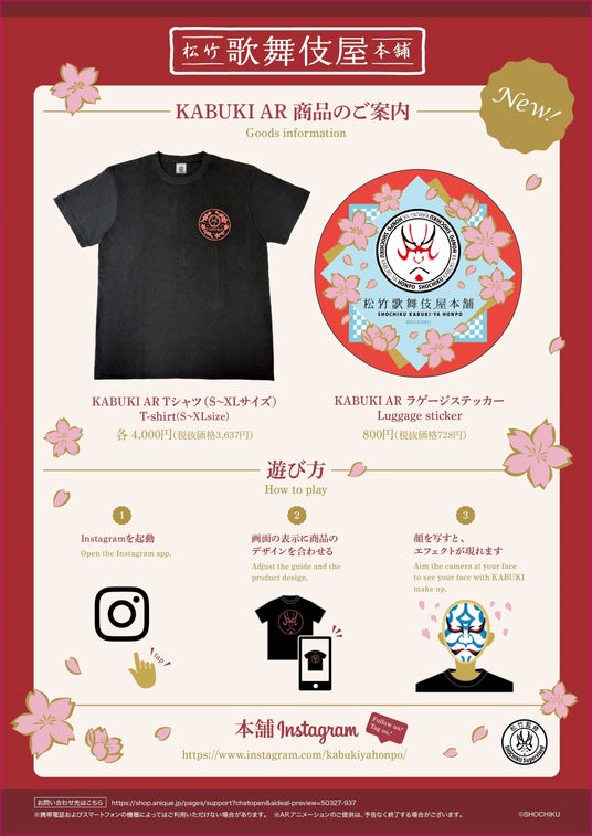 今回発売の商品は、来店の記念となるように松竹歌舞伎屋本舗のロゴマークがデザインされたTシャツとラゲージステッカーの2アイテム。商品デザインをスマホで読み込むことで、『京鹿子娘道成寺』の世界をイメージしたARアニメーションがInstagramのエフェクトとして現れ、隈取と、桜が舞い散る日本らしい景色をお楽しみいただけます。是非この機会にお買い求めください。