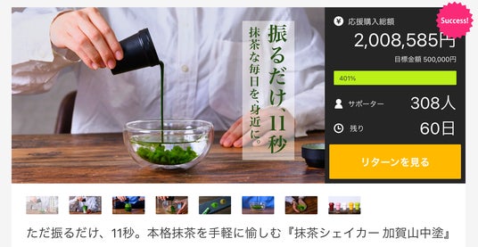株式会社吉村(東京都品川区、代表:橋本久美子)は、本格抹茶を手軽に愉しむ『抹茶シェイカー 加賀山中塗』を、Makuakeにて先行発売中です。開始から1週間たたずに、達成率400%(総額200万円)を突破しました。