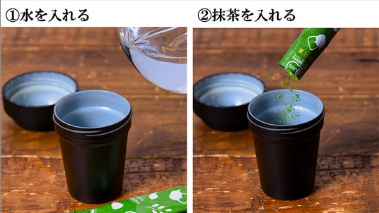 - 特徴1:水と抹茶を入れて振るだけで濃厚な抹茶原液に