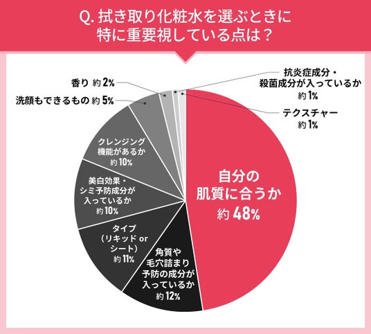 拭き取り化粧水に関して自身の肌質とのマッチングを気にしている人が全体の約48%いることがわかりました。また、付随して自身が抱えている肌トラブルへのケアができるかどうかも気にしているようです。