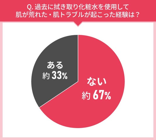 約33%の人が肌トラブルの経験があると回答しました。日頃から化粧をすることが多い人の場合、拭き取り化粧水を使う頻度も多くなるので、肌質に合う合わないは考えていきたいですね。