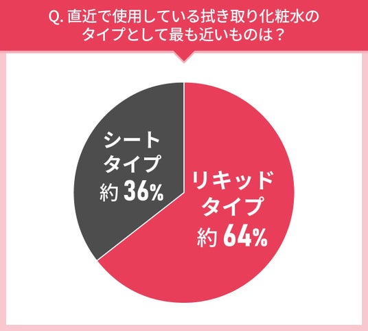 リキッドタイプと回答した人が約64%いました。リキッドタイプは多くの場合ボトルなどに入っており、コットン染み込ませて使用するタイプです。お家で自分の好きな量で使えて、顔以外にも使用したい場合にもぴったりです。大きめのボトルもあるので、コスパを意識したい人にもおすすめです。