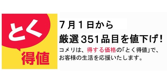 日用品や食料品など、生活必需品の相次ぐ値上げにより、家計への負担が増し、生活に大きな影響を与えています。そんな“物価高”という見えない不安からお客様の生活を守るため、コメリでは、独自の流通網と全国約1,200店舗のマス・メリットを活用し、商品の値下げを行い、「とく得値」として販売しております。