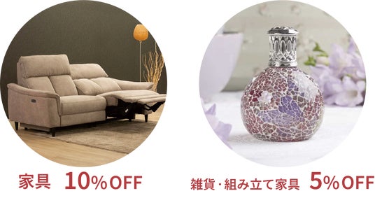 家具が10%OFF、インテリア・雑貨・組み立て家具は5%OFFでお買い求めいただけます。