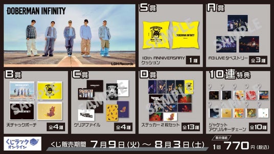 カルチュア・エンタテインメント株式会社は、結成10周年シングル「1st SONG」の発売を記念して『DOBERMAN INFINITY』とコラボレーションした、ハズレ無しでオリジナルグッズがゲットできるオンラインくじ「くじラックオンライン」を2024年7月9日(火)より発売開始いたします。賞品はA賞~E賞まで全5アイテムとなっており、さらに、くじ1枚ご購入ごとにWチャンス賞の抽選が行われ、当選した方は特別な賞品が獲得できます。
