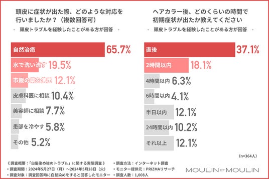 また、「ヘアカラー後、どのくらいの時間で初期症状が出たか教えてください」と質問したところ、『直後(37.1%)』と回答した方が最も多く、次いで『2時間以内(18.1%)』と続きました。