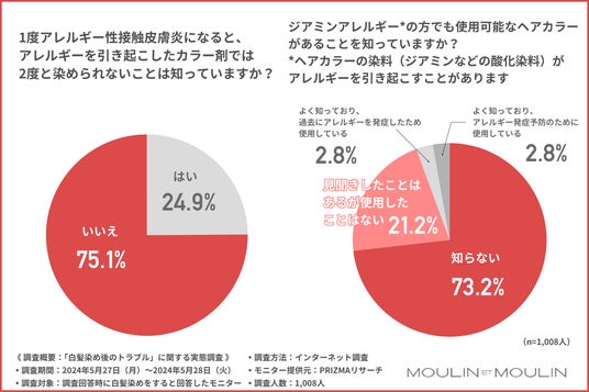 「一度アレルギー性接触皮膚炎になると、アレルギーを引き起こしたカラー剤では2度と染められないことは知っていますか?」と質問したところ、約8割の方が『いいえ(75.1%)』と回答しました。