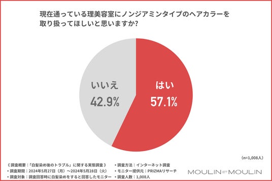最後に、「現在通っている理美容室にノンジアミンタイプのヘアカラーを取り扱ってほしいと思いますか?」と質問したところ、約6割の方が『はい(57.1%)』と回答しました。