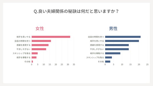 最後に「夫婦関係がうまくいかないと感じたことはありますか?」という質問に「いいえ」と答えた方に「よい夫婦関係の秘訣」について伺いました。女性側の第一位は「相手を思いやる」で32票。男性側の第一位は「会話の時間を持つ」が21票でした。どちらも職場の人や友人には当たり前のようにやっていることかもしれません。近い相手だからこそ、つい忘れてしまいがちですがよい夫婦関係を作るためには基本的な人間関係のマナーが重要です。「夫婦関係がうまくいってない」と感じている方は、お互いに話をして、聞く時間を作ってみてはいかがでしょうか。お互いにイライラしている時ではなく、ちょっと余裕がある時に話すことがポイントです。相手の気持ちを考えて、感謝を伝える。自分の意見を言葉で伝え、相手の意見に耳を傾ける。ずっと一緒にいる夫婦だからこそ、こういった人間関係の基本に戻ってみるのも大切かもしれません。