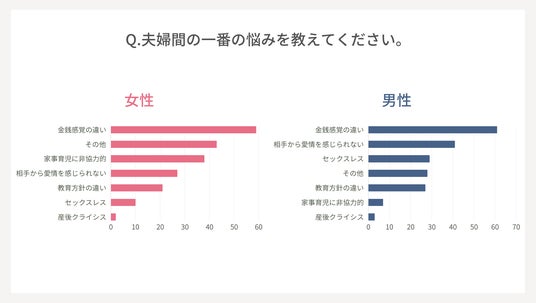 - 夫婦間の悩み第一位は男女ともに「金銭感覚の違い」でした。