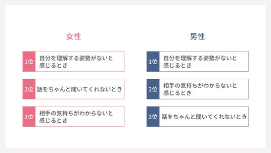 女性も男性も第一位は「自分を理解する姿勢がないと感じる時」となりました。「相手が自分の気持ちを理解してくれない」と感じる状況が続くと、諦めの気持ちが芽生えることもあります。コミュニケーションを続けていく意欲も失われてしまうかもしれません。