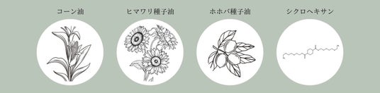 製品のベースとなるオイルは、種類や配合量の微差によって酸化が進む原因や、皮脂と混ざった際に発生する酸化臭の要因にもなります。そのためメイン基材成分として使用しているオイルの選び方が重要です。 本製品がメインで使用しているオイルは、原料臭がほぼなく、酸化しにくいのが特徴です。4種類を独自の黄金比で配合することで、頭皮をすこやかにし、ケアを続けることによっての髪質の変化にも期待できると言われています。