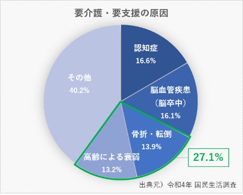 令和4年 国民生活基礎調査によると、要介護、要支援の原因は、「認知症」の16.6%、「脳血管疾患(脳卒中)」の16.1%に次いで、「骨折・転倒」13.9%、「高齢による衰弱」13.2%など身体機能の衰えによるものが多く、筋肉がやせ衰える筋萎縮や関節が動きにくくなる関節萎縮などの廃用症候群の予防が注目されています。