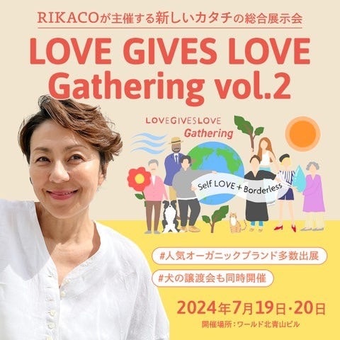 「LOVE GIVES LOVE Gathering」とは、タレント業と起業家として活躍するRIKACO氏が主催し、エグゼクティブサポーターとして吉川千明氏を迎えた、総合展示会です。本イベントは、「Self LOVE」をテーマに、マインド、ジェンダー、ビューティー、セクシュアリティなどにおいて、ボーダーレスなアプローチを提案し、参加者がつながりを深める場を提供します。