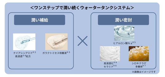 ワンステップでも長時間潤いをキープするために、3種の潤い密封成分※5-7を配合。与えた水分を瞬時に補給&密封することで、1日ずっと※1うるぷる貯水肌が続きます。