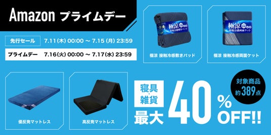 寝具やインテリア雑貨など様々な商品を取り揃えている新陽トレーディングは2024年7月16日(火)0:00から7月17日(水)23:59まで、Amazonプライム会員限定の「Amazon プライムデー」にて、衝撃の最大40%のビッグセールを開催いたします。今夏必須の暑さ対策寝具の「極涼シリーズ」や大人気マットレスブランド「エムリリー」、コスパ最強の三つ折りマットレスなど様々な商品を特別価格でご購入いただけます。