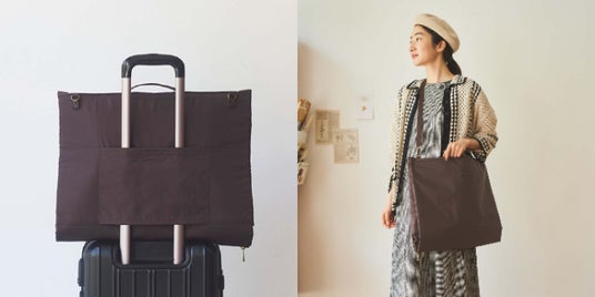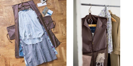 スーツなどを収納するガーメントバッグから着想を得たトラベルバッグです。ハンガーに掛けたまま入れるだけで、パッキングが完了します。コンパクトなのに、ハンガーおよそ4本分の洋服を収納できて、アクセサリーやインナーなどの小物類を入れることができる便利なファスナーポケットも付いています。旅先でもバッグごと掛けられるので、そのままマイワードローブが完成します。