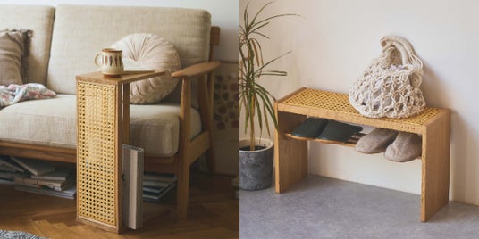 ナチュラルなラタン風のサイドテーブルです。透かし編みが軽やかなデザインでお部屋にあるだけで、ほんのりリゾート感が漂います。ソファやベッドでお茶を飲んだり、読書をしたり、くつろぎタイムのお供にぴったりです。横置きしても使える2-WAY仕様で、スリムで場所を取らないので、玄関やトイレのちょい置き棚にも便利です。