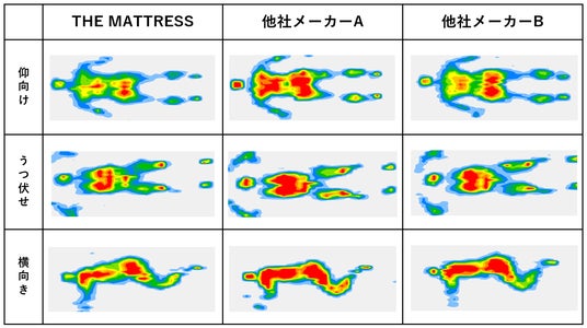 「THE MATTRESS(ザ・マットレス)」はその特殊な設計により、仰向け、横向き、そしてうつ伏せの、どの寝姿勢でも体を優しく包み込み、寝返りをサポートします。これにより、快適な睡眠環境を提供し、日常生活の質の向上に貢献することを目指しています。