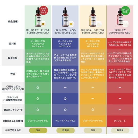 日本では数少ない規格の商品も含め4つのタイプの特徴的なCBDオイルがあります。