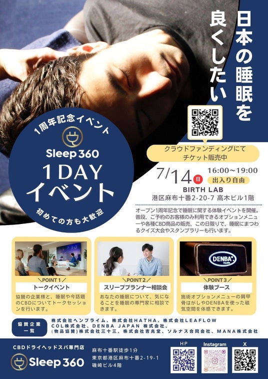 株式会社HEMPRIME世界で最も睡眠時間が短い国、日本の「戦う脳を再起動」。美容師出身のセラピスト考案の施術で睡眠の質向上と日中のパフォーマンスを最大化させるSleep 360の周年イベント、7月14日(日)開催!