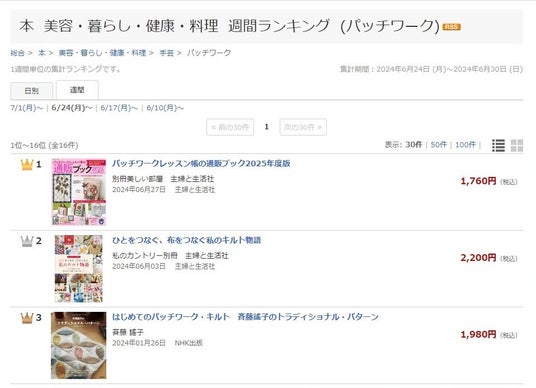 ★Amazon売れ筋ランキング[本/パッチワーク・キルト]第1位(2024.7.5)、楽天ブックス ランキング 本 美容・暮らし・健康・料理 週間ランキング (パッチワーク)第1位(2024.6.24~)を獲得しました!