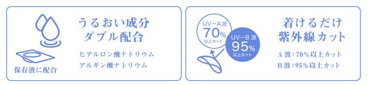 涙の水分をたくわえ乾燥を防ぐヒアルロン酸ナトリウムと、海藻由来の天然保湿成分がレンズの水分を保持するアルギン酸ナトリウムを配合しています。さらに目の負担になる紫外線をカットできます。