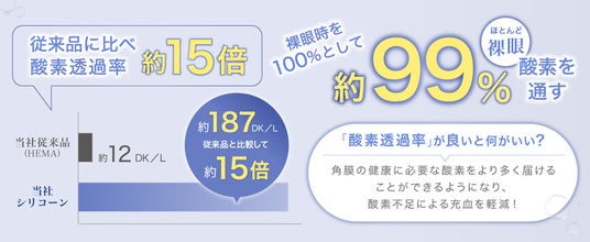 酸素透過率は従来品と比べて約「15倍」以上となっており、瞳の負担を軽減することができます。