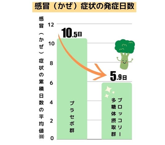 出典:2023臨床試験(投稿準備中:RCTの群間比較でブロッコリー多糖体を摂取した被験者群ではプラセボ群よりもpDCの活性が有意に高く感冒症状の発症日数が有意に少なかった。薬理と治療. 50(6):1065-1078(2022),薬理と治療. 40(6):489-494(2012)