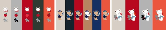 (左から)「たのしいおもいで」:ファミリアで人気の高い、マリンルックのクマ。爽やかな配色は、ユニセックスでおすすめです。「どれがすき?」:ファミリアらしいモチーフ3点を使用。本革の質感とシンプルなデザインが重なり、大人かわいい仕上がりになっています。「いつもなかよし」:仲良しのクマとテリアのアート。ハンドベルトを付けると、ふたりが一緒にこちらをのぞいているような見た目に。