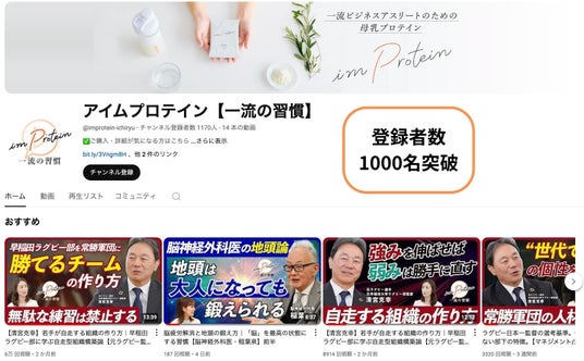 「アイムプロテイン」公式YouTube動画が登録者数1,000名突破