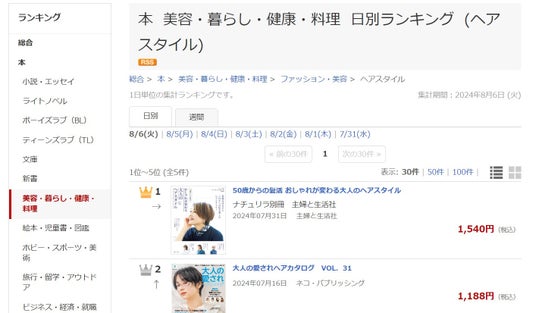 ★楽天ブックス 本 美容・暮らし・健康・料理 日別ランキング (ヘアスタイル)で1位を獲得しました!(2024年8月6日付)