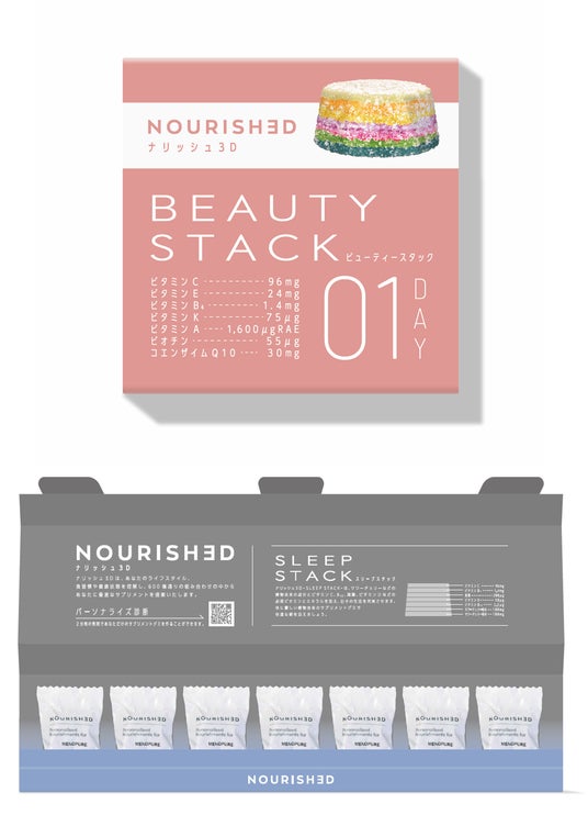 通常ECサイトでのみ販売を行っているNOURISH3Dの製品ですが、ポップアップ期間中限定で店頭にて購入いただけます。また、オンライン上で製品を購入いただいたお客様からのフィードバックを基に、日本限定品を含むプレブレンド・サプリ6種を発売。「SLEEP STACK」や、「SHAPE STACK」など、ライフスタイルの様々な場面に合わせた6種類のグミサプリを、トライアルしやすい7DAYS(7個入り)、または1DAYからお選びいただけます。なお、今回プレブレンド・サプリのパッケージを一新し、新発売いたします。細長いパッケージが印象的な7DAYSは1粒ずつ取り出せるようになっており、お客様の毎日の健康習慣をサポートしたいという思いが込められています。スタイリッシュでカラフルなパッケージを店頭でお楽しみください。