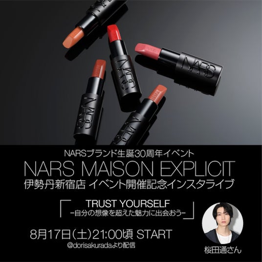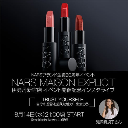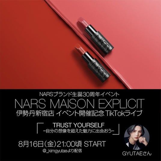 1994年、フランソワ・ナーズにより12本のリップスティックからはじまったNARS。今年、ブランド生誕30周年を迎えるにあたり、スペシャルなイベント「NARS MAISON EXPLICIT」を2024年8月14日(水)~8月20日(火)の期間、伊勢丹新宿店 本館1階 ザ・ステージにて開催します。また、これまでご愛顧いただいたお客様へ感謝の気持ちを込めて、スペシャルゲストを迎え、“TRUST YOURSELF -自分の想像を超えた魅力に出会おう-”をテーマに、ライブ配信のイベントを開催いたします、ゲストおすすめのカラー展示や、19時~20時のライブ前の営業時間内で、ご本人の来場してのポップアップの壁へのサインも実施予定です。