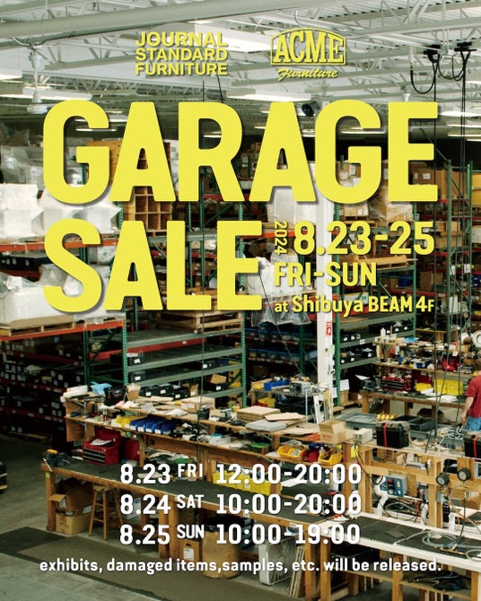 「JOURNAL STANDARD」や「IENA」など、衣食住美を展開する株式会社ベイクルーズ (本社:東京都渋谷区) の JOURNAL STANDARD FURNITUREとACME Furnitureは、8月23日(金)~25日(日)の3日間、倉庫で眠っていたサンプル品や展示品、 B品、廃盤品を販売するスペシャルイベント「GARAGE SALE」を渋谷 BEAM 4Fで開催いたします。