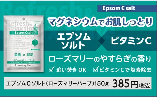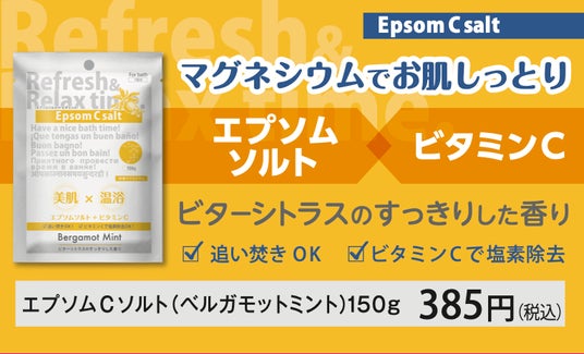 商品は、エプソムソルトに塩素除去成分のビタミンCを配合した従来品に香りを加えた国内製造製品が1.5kgで1,400円。一般の入浴料に比べてコストパフォーマンスが高いのも魅力です。