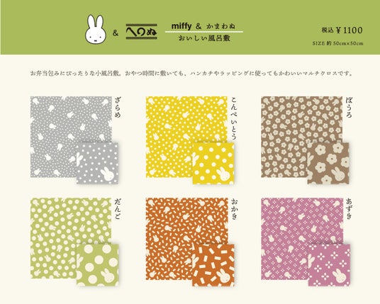 ミッフィーのおいしい風呂敷:全6種類「ぼうろ」や「こんぺいとう」そして「だんご」など、どこかなつかしい「おやつ」をテーマにしたモチーフをデザイン。世代を超えて愛されるミッフィーと、昔ながらの「おやつ」は相性ぴったり。ぬくもりを感じる、おいしそうな色合いに仕上げました。50cmサイズの小風呂敷はお弁当を包むのにはもちろん、ちょっとしたお菓子のプレゼントを包んでエコフレンドリーラッピングにも!